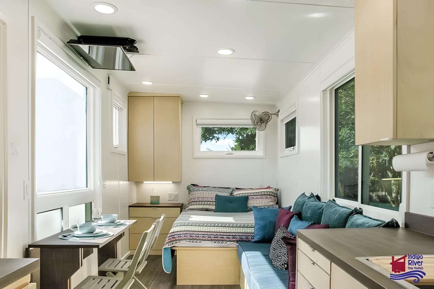 Мини-дом IndigoGo! от компании Indigo River Tiny Homes — это пример того, как гибкий дизайн может превратить компактное жильё в пространство, способное адаптироваться к самым разным сценариям жизни. Дом имеет одноэтажную планировку, но его размеры и конфигурации варьируются от ультрамаленького варианта длиной всего 4,8 метра до полноценного «квартирного» формата длиной 12,2 метра.