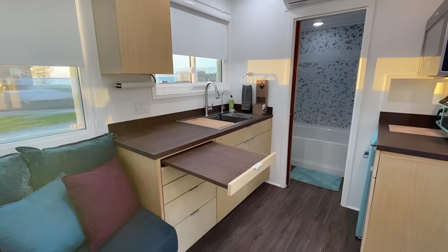 Гостиная оборудована диваном-кроватью с ящиками для хранения и столом, который может служить как обеденной зоной, так и рабочим местом. Телевизор установлен на потолочном кронштейне и легко опускается для просмотра. Кухня выполнена в стиле камбуза: компактная, но функциональная, с раковиной, холодильником, микроволновкой и выдвижной секцией для увеличения рабочей поверхности. При желании её можно модернизировать, добавив больше техники.