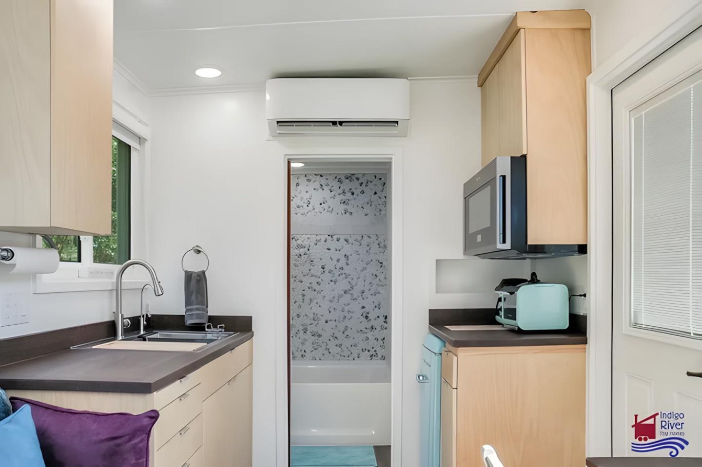 Ванная комната, отделённая дверью, удивляет своей полнотой: здесь есть ванна/душ, раковина и унитаз. Спальня расположена на противоположной стороне дома и оснащена двуспальной кроватью с дополнительными местами для хранения, прикроватной тумбочкой и шкафом. Благодаря одноэтажной планировке, в доме можно стоять в полный рост, что делает его более удобным, чем многие лофтовые модели.