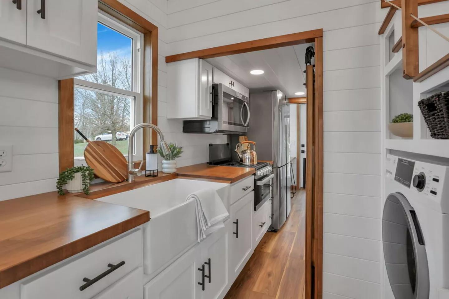 Кухня оборудована всем необходимым для полноценной жизни: раковиной в деревенском стиле, газовой духовкой и варочной панелью, микроволновкой, большим четырёхдверным холодильником с морозильной камерой и даже стиральной машиной с сушкой. Дополняют её изготовленная на заказ мебель с кленовыми столешницами, барная стойка и дополнительная рабочая поверхность. Рядом находится компактная ванная комната с душем, раковиной и унитазом.
