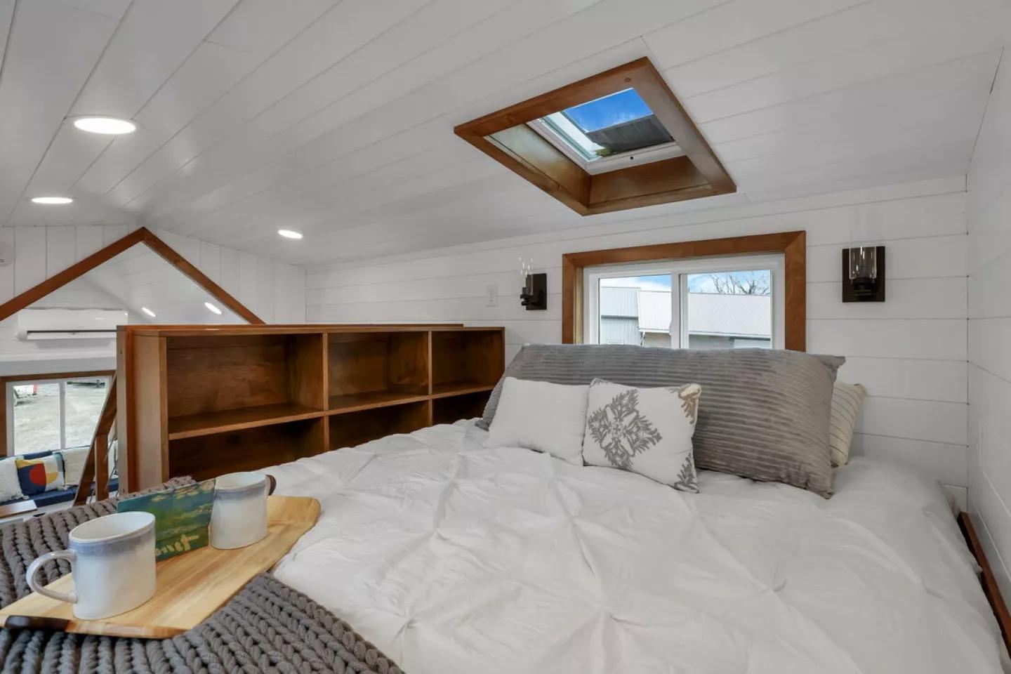 Единственная отдельная спальня находится на втором уровне. Лестница со встроенными шкафами ведёт в уютный лофт с низким потолком, двуспальной кроватью и полками для хранения. Мансардное окно наполняет комнату естественным светом и создаёт ощущение простора.