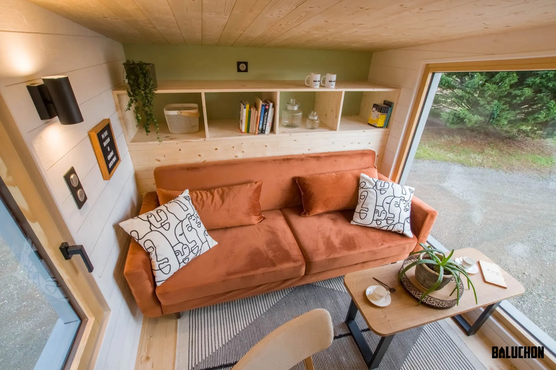 Как уже упоминалось, гостиная находится наверху. Доступ к ней осуществляется с помощью нескольких ступеней, интегрированных в систему хранения, которые можно убрать, если потребуется больше места для приготовления пищи. Гостиная имеет достаточно высокий потолок и широкие окна, наполняющие дневным светом, а также диван, который превращается в двуспальную кровать. Также здесь есть немного места для хранения вещей, и разработчикам даже удалось уместить в гостиной небольшой домашний офис с письменным столом.