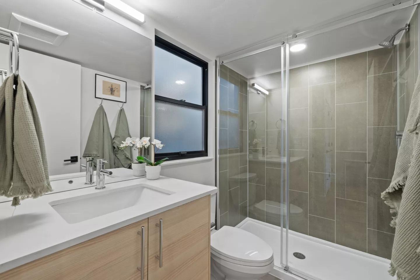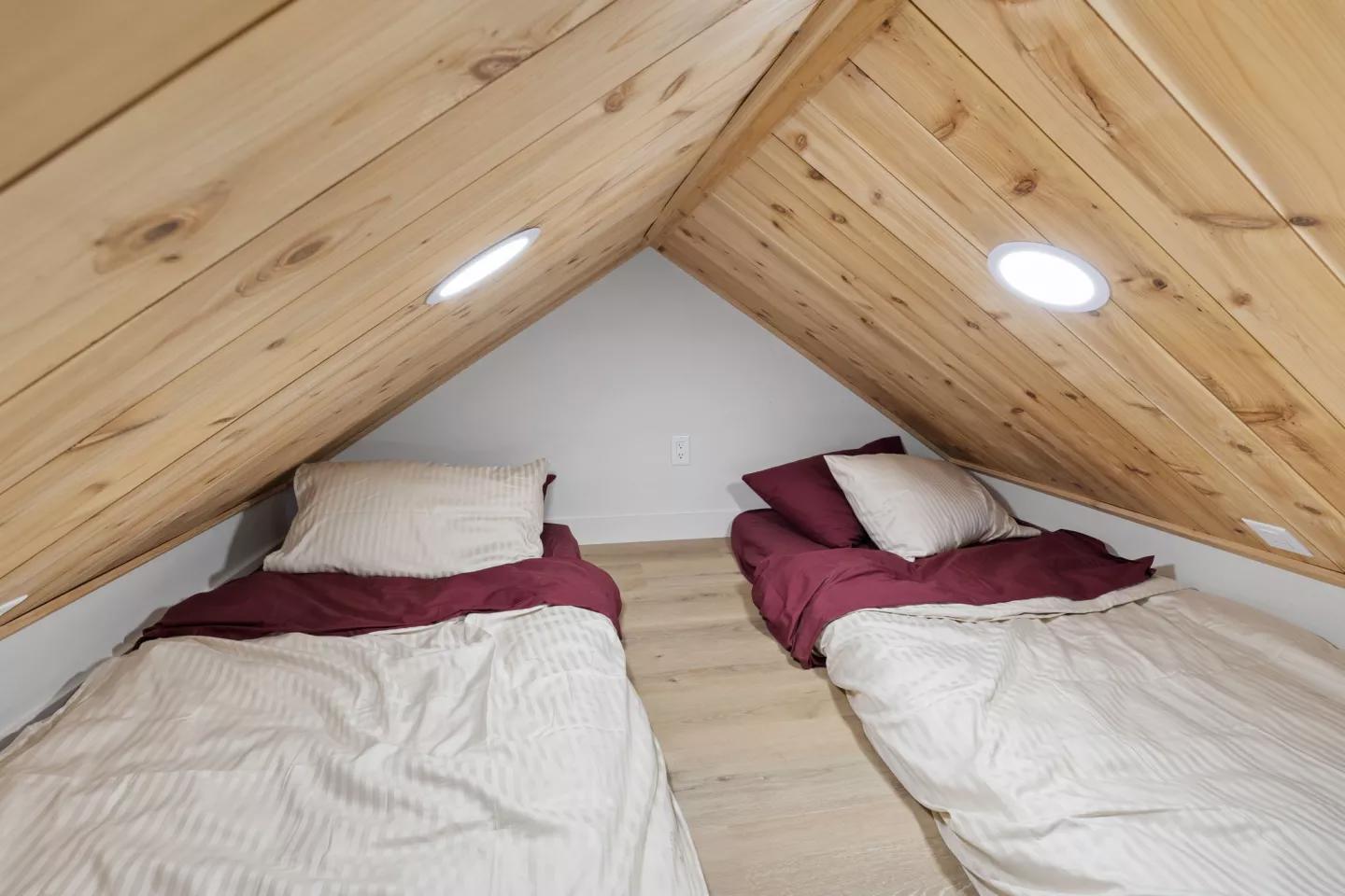 В доме предусмотрены две спальни. Основная расположена на первом этаже: здесь полноценная высота потолка, двуспальная кровать, встроенные шкафы и отдельный кондиционер. Рядом находится ванная комната с душевой кабиной, раковиной и унитазом. Вторая спальня — мансардная, доступная по лестнице из гостиной, подходит для двуспальной или двух односпальных кроватей, хотя требует добавления аварийного окна.