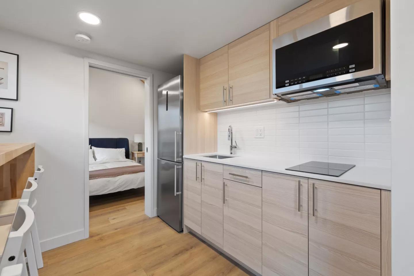 Кухня примыкает к гостиной и отличается продуманной, хотя и лаконичной планировкой. В ней есть барная стойка на четырёх человек, раковина, индукционная плита, микроволновка и холодильник с морозильной камерой. Обилие шкафов обеспечивает достаточное хранение.