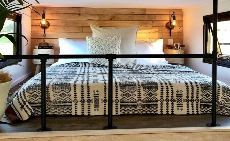 Спальня расположена наверху в необычно большом спальном лофте, в котором умещаются не только кровать размера «queen-size», но и даже столик.
