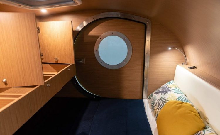 С другой стороны трейлера расположена уютная каюта с окнами в морском стиле, где установлена кровать размера «queen-size» со встроенным мягким подголовником. Три шкафа и три ящика создают много места для хранения даже в таком компактном интерьере. Потолочные и точечные светильники обеспечивают освещение после заката.
