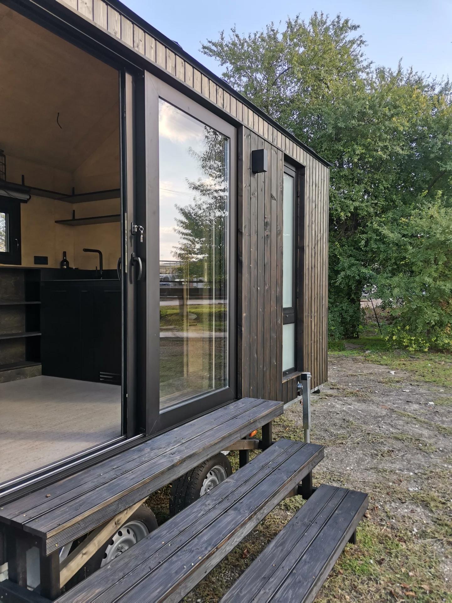 Проект разработан болгарской компанией Koleliba совместно с архитектором Христиной Христовой. Дом установлен на двухосном прицепе и имеет длину 5,5 метра, что делает его особенно компактным и мобильным. Внешне он выглядит современно и лаконично: вертикальная деревянная обшивка сочетается с металлическими элементами, а большие окна и раздвижные стеклянные двери обеспечивают хорошее естественное освещение.