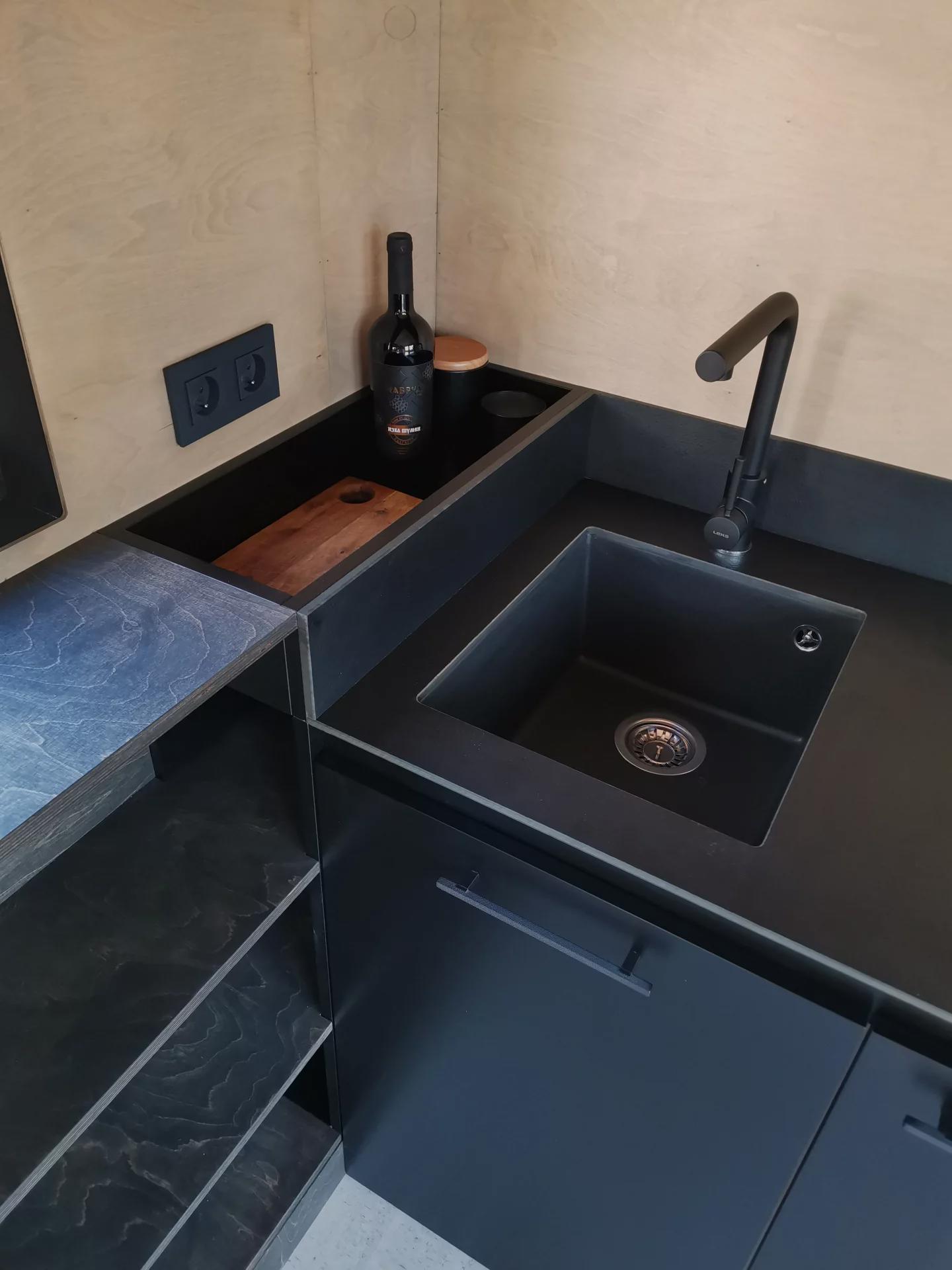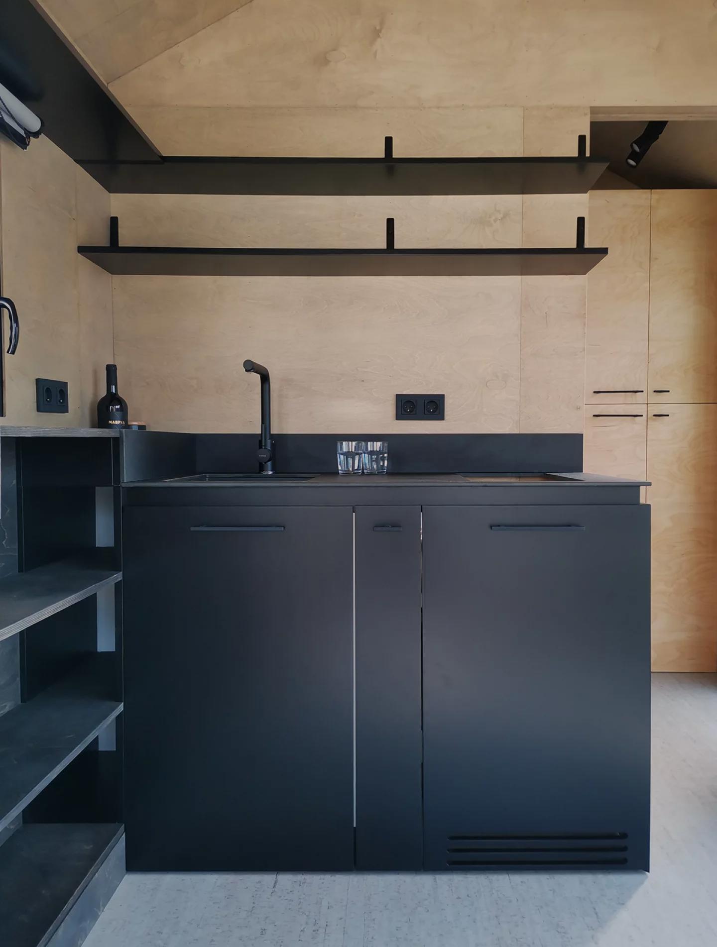 Дополнительным функциональным элементом является шкаф с выдвижным столом, который можно использовать как рабочее место или обеденную зону. Над ним расположены полки для хранения вещей. Кухня выполнена в минималистичном стиле и включает раковину, индукционную плиту, шкафы и место для компактной бытовой техники.