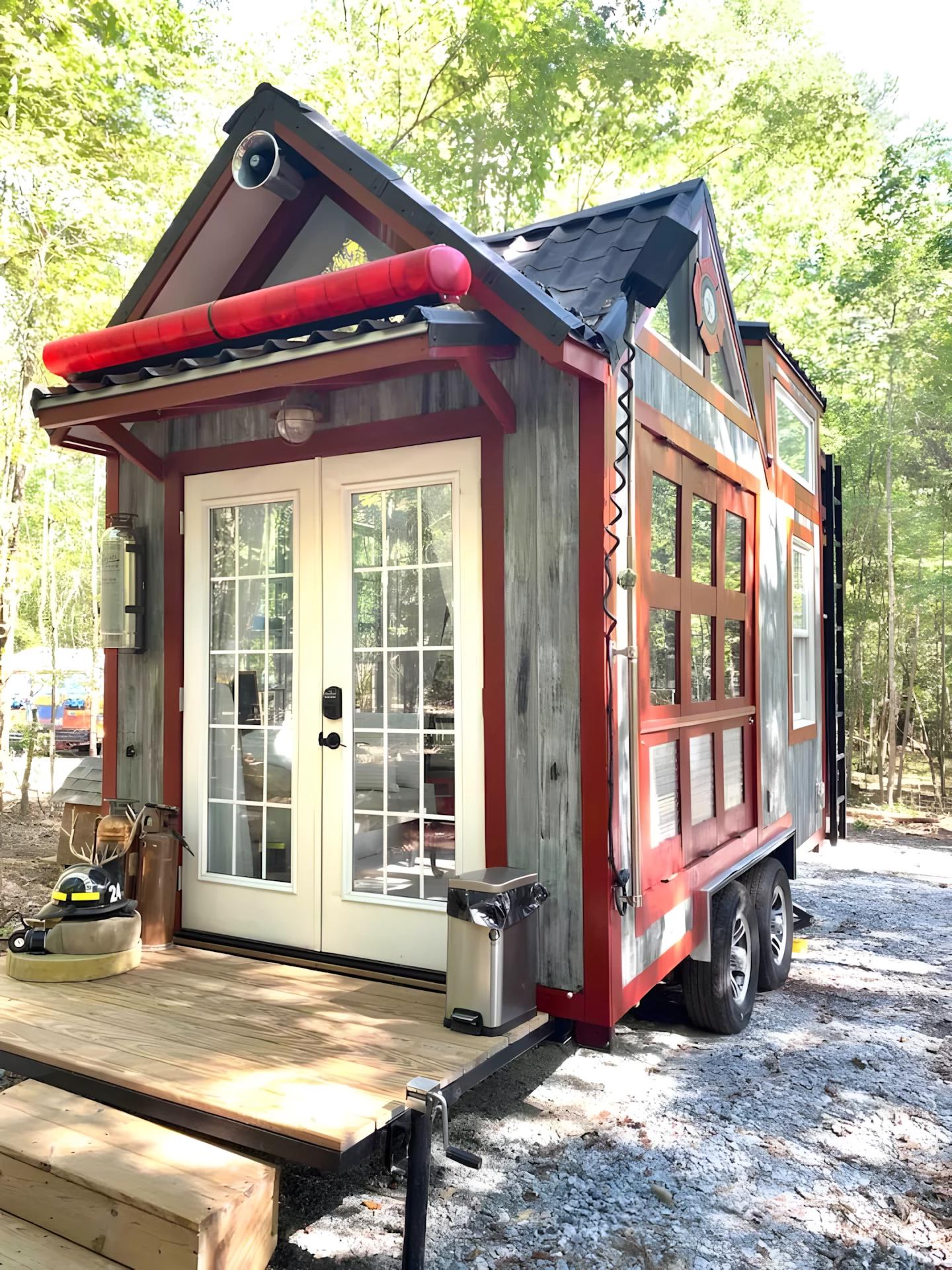 Построенный компанией Beloved Cabin в честь пожарных и сотрудников экстренных служб, Tiny Firehouse — компактная североамериканская модель длиной всего 4,8 метра, смонтированная на двухосном прицепе. Внешняя отделка выполнена из дерева с яркими красными акцентами, а на крыше расположена небольшая терраса, доступная снаружи по лестнице. На фасаде размещены элементы пожарной тематики: шлем, кислородный баллон и (неработающая) сирена над входом.