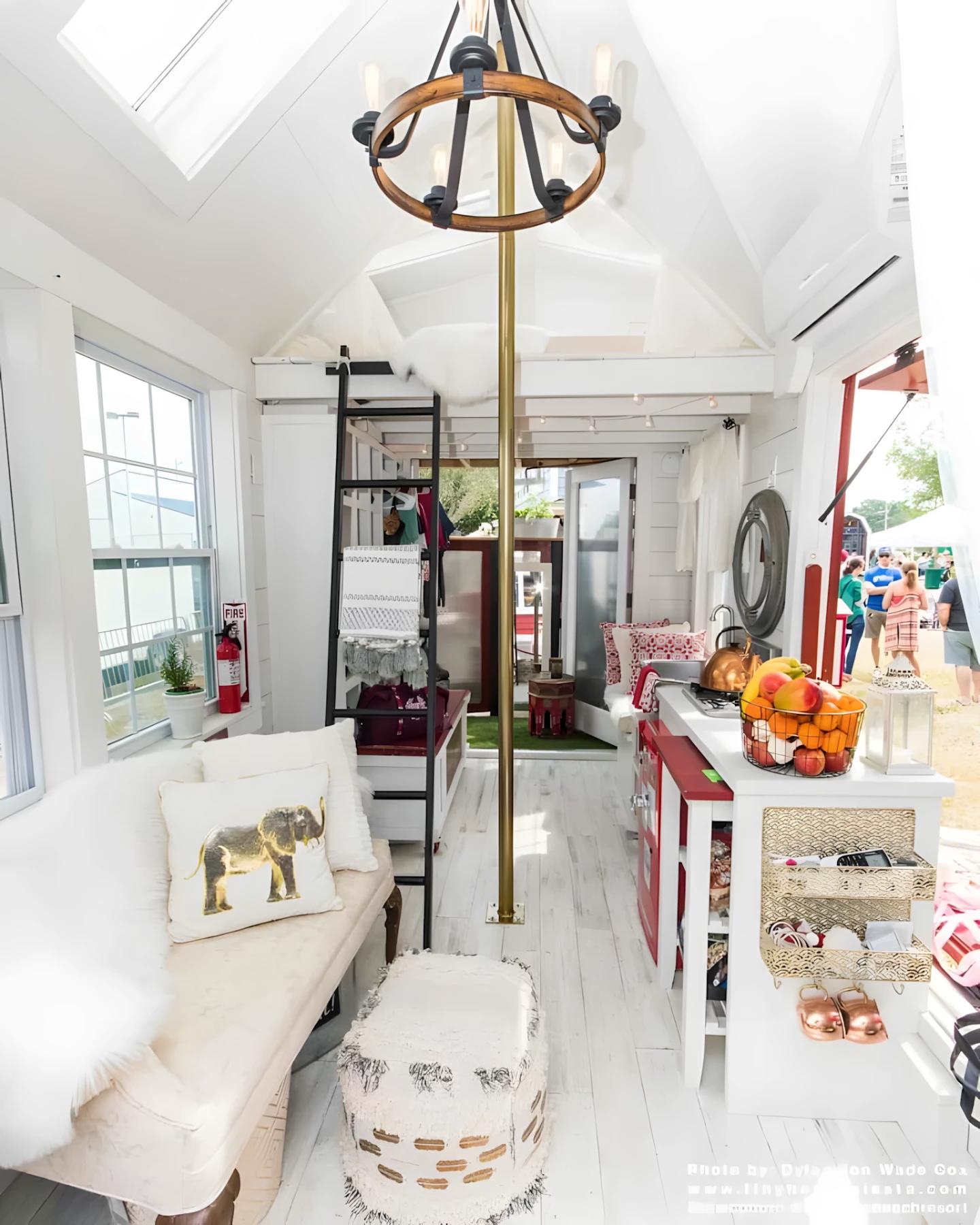 Вход осуществляется через террасу и несколько двойных дверей. Интерьер выглядит светлым благодаря множеству окон и мансардных проёмов. Гостиная небольшая, но уютная, включает диван, а одна из стен дома открывается наружу на гидравлических стойках, обеспечивая отличную вентиляцию. Рядом расположена кладовка и несколько декоративных элементов, напоминающих о пожарной службе.
