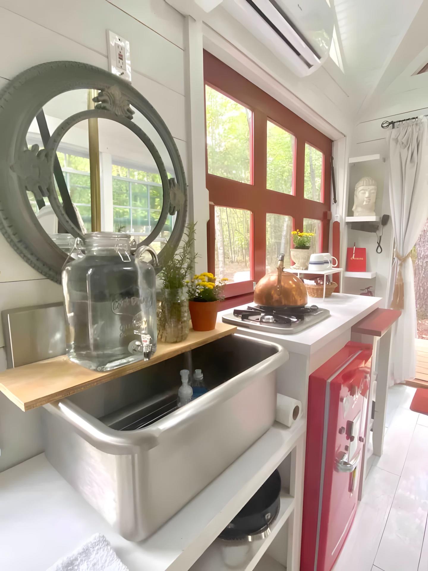 Кухня в доме компактная и функциональная: здесь есть раковина из нержавеющей стали с ножным управлением, двухконфорочная газовая плита и холодильник. Такой дизайн подчёркивает, что дом предназначен прежде всего для отдыха и развлечений, а не для постоянного проживания.
