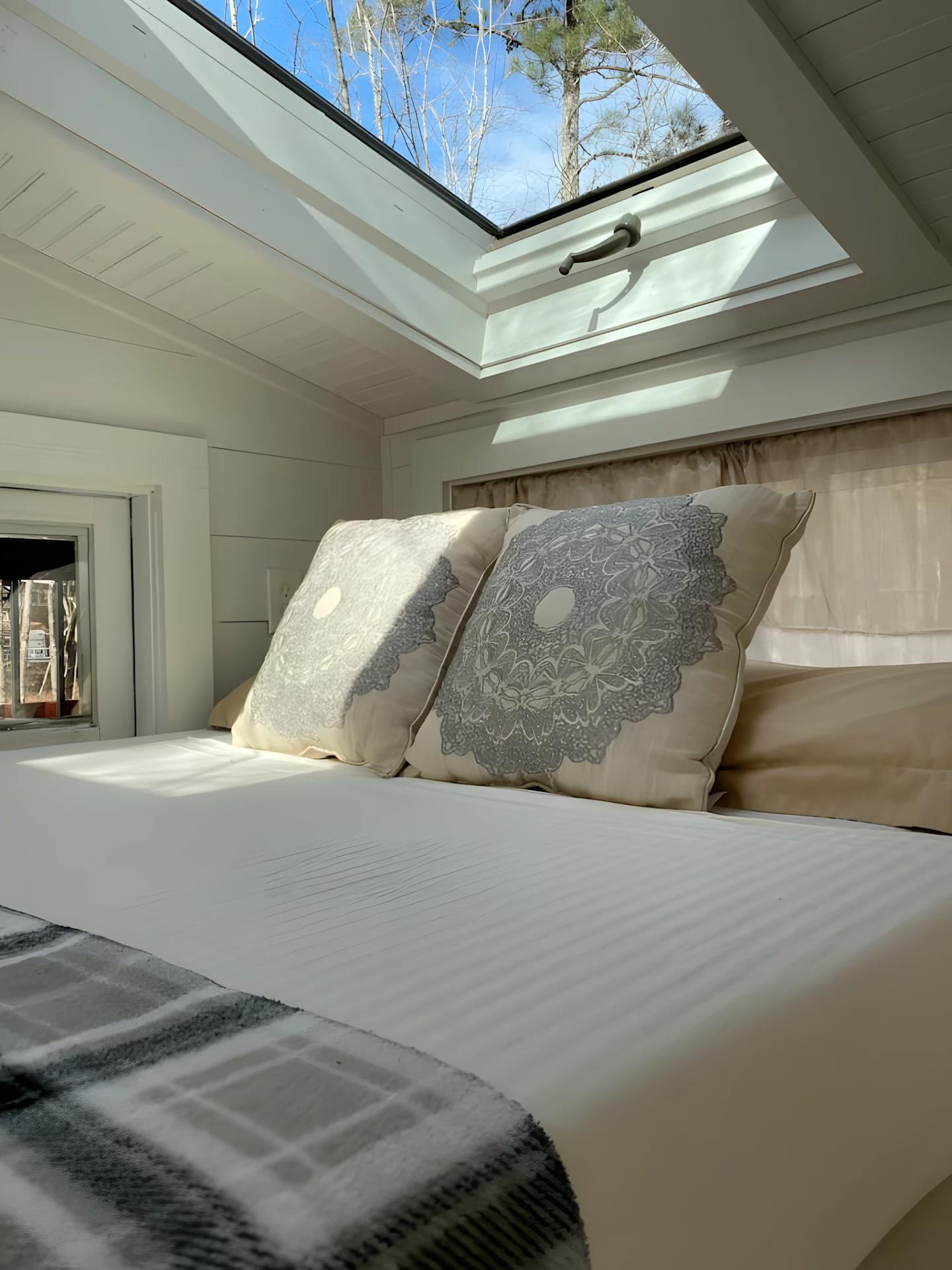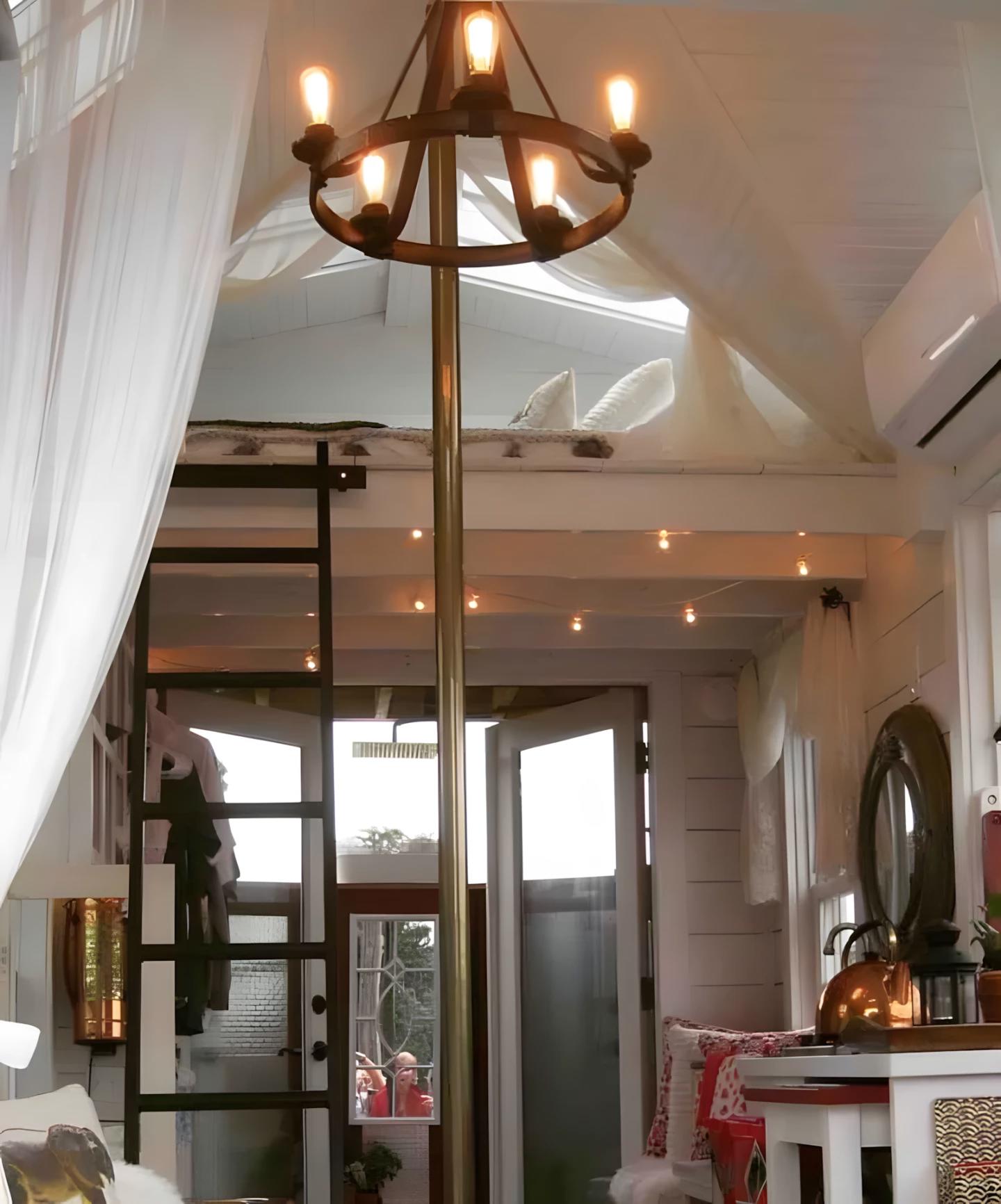 На втором этаже расположена спальня с низким потолком и двуспальной кроватью, доступная по съёмной лестнице. Пожарный шест проходит через чердачное пространство, позволяя любителям приключений быстро спуститься вниз. Крошечная пожарная часть установлена в поселке мини-домов на озере Окони в Джорджии и доступна для аренды на Airbnb, став любимым местом отдыха для ценителей уникальных миниатюрных домов.