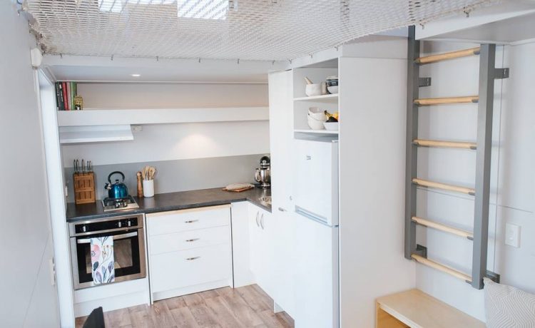 Входя в дом, посетители сразу попадают на кухню, которая оснащена холодильником с морозильной камерой, двухконфорочной плитой с духовкой на пропане и раковиной. Благодаря большой выдвижной кладовой, на кухне много места для хранения, а за съемным кухонным шкафом спрятана стиральная машина.