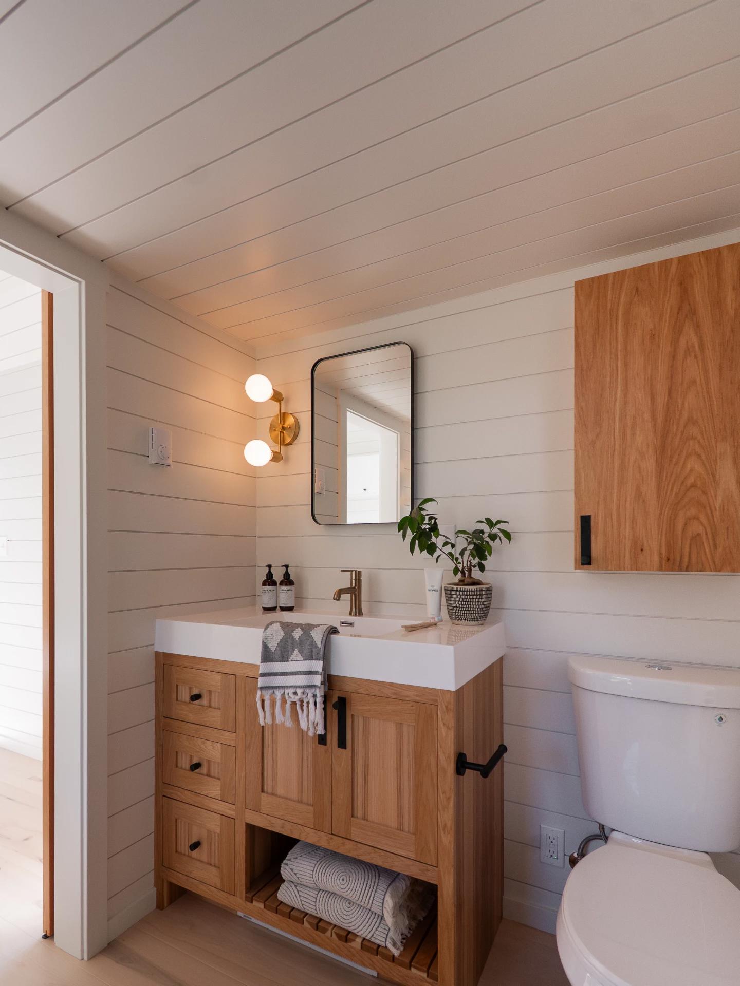 Рядом с гостиной находится кухня, оснащенная холодильником с морозильной камерой, духовкой с 4-конфорочной плитой, посудомоечной машиной, раковиной, а также отдельными стиральной и сушильной машинами. Кухня рассчитана на трёх человек, в ней довольно много шкафов и столешницы из клёна. Кухня отделена от ванной комнатой раздвижной дверью. В ванной комнате установлены ванна с душем, что является редкой роскошью для крошечного дома, а также унитаз со смывом и раковина с подходящей по размеру аптечкой из орехового дерева.