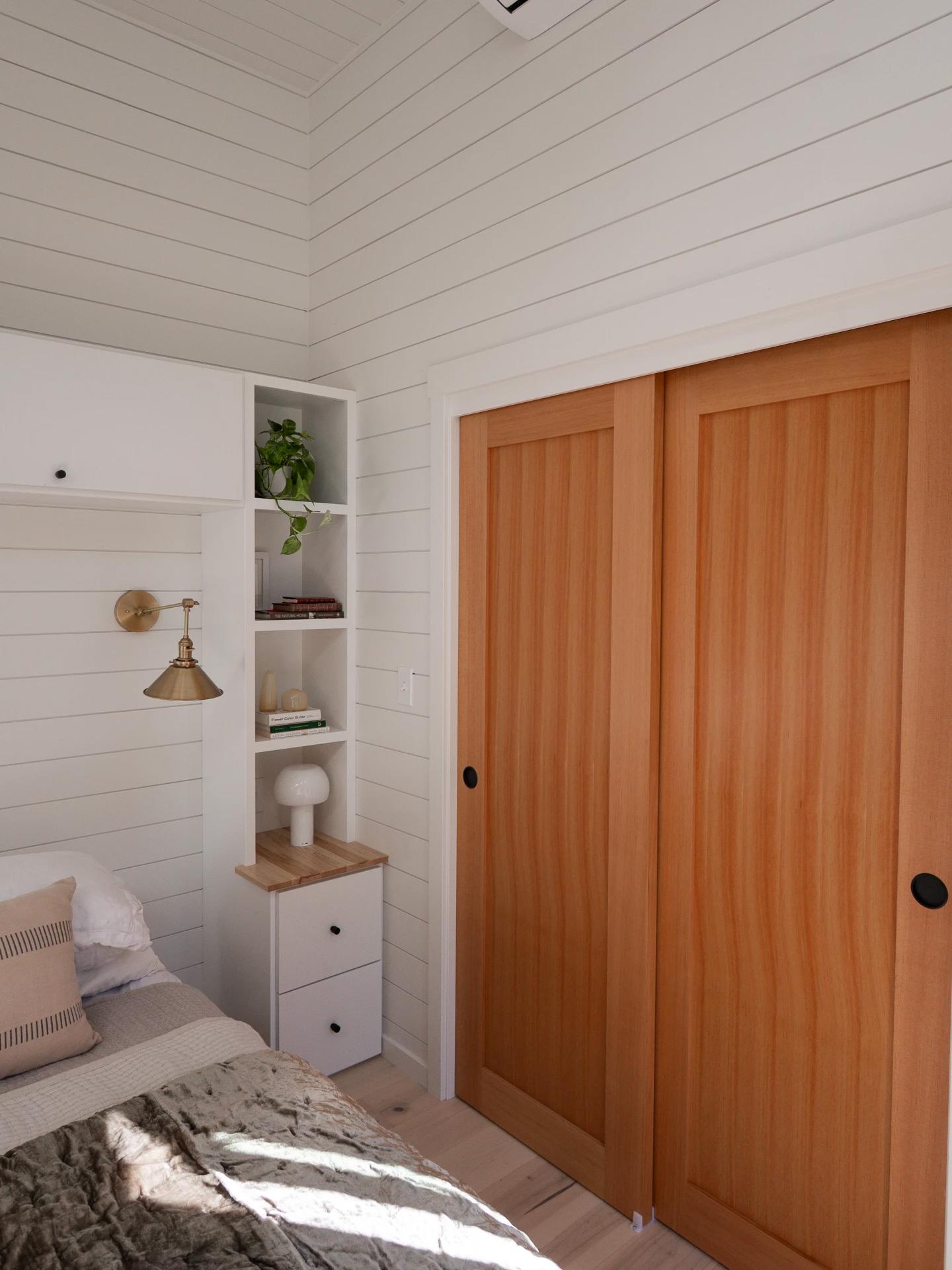 Ещё одна раздвижная дверь на кухне ведёт в главную спальню с высоким потолком, встроенным шкафом, двуспальной кроватью и отдельным выходом на улицу. В этой модели также есть вторая спальня, куда можно подняться по съёмной лестнице. Это типичная спальня-мансарда с низким потолком и двуспальной кроватью.