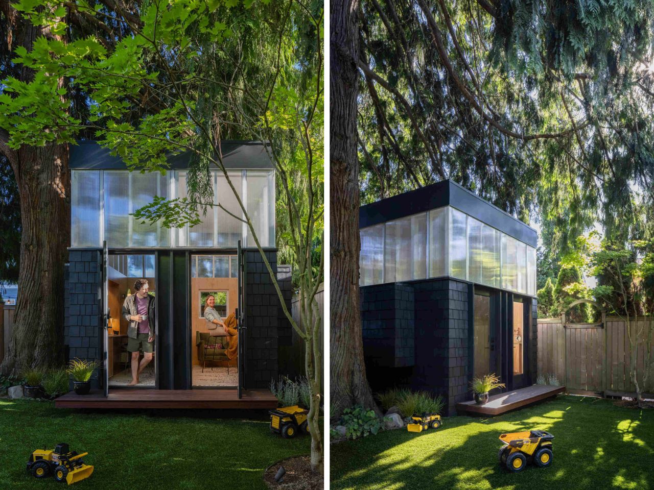 Свет стал самым преобразующим элементом дизайна домика WORK_shed. Архитекторы из Linework Architecture подняли стены до максимальной высоты зонирования и обернули верхнюю часть полупрозрачными поликарбонатными панелями. Эти рассеивающие панели пропускают мягкий дневной свет сквозь ветви старинного дерева, наполняя пространство изменчивыми узорами света и тени.