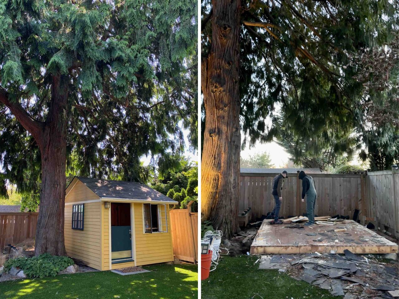 В качестве основы для проекта архитекторам достался небольшой сарай на заднем дворе, площадью всего 9,2 кв. метра, который было решено не сносить до конца, а оставить платформу для будущего дома-офиса. Это решение позволило сэкономить средства, сократить количество строительных отходов и сохранить корни соседнего старинного дерева.