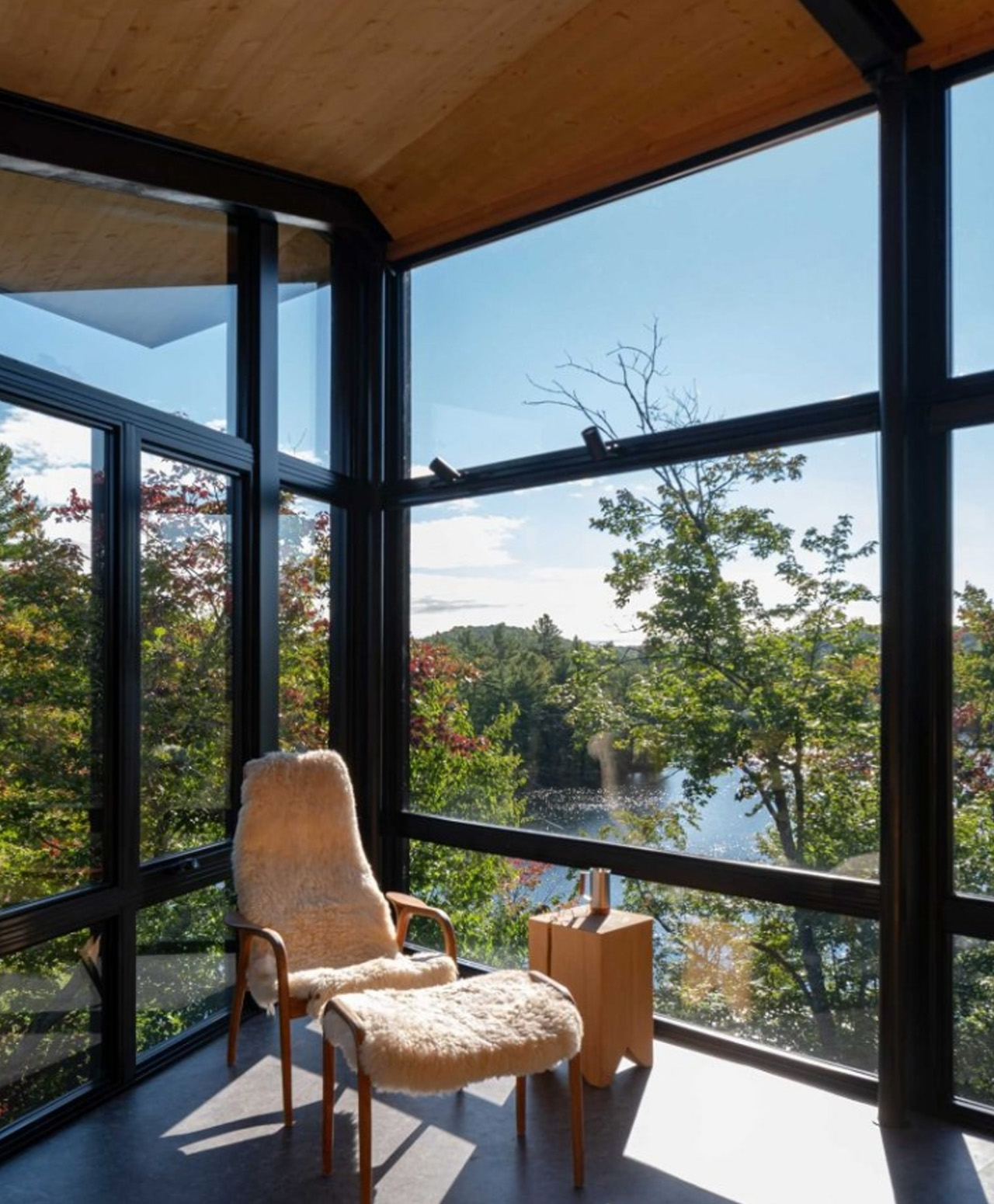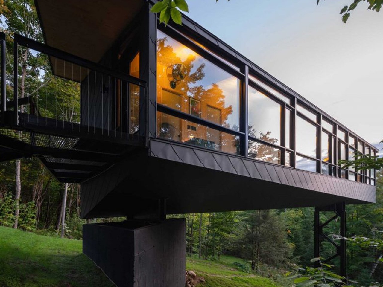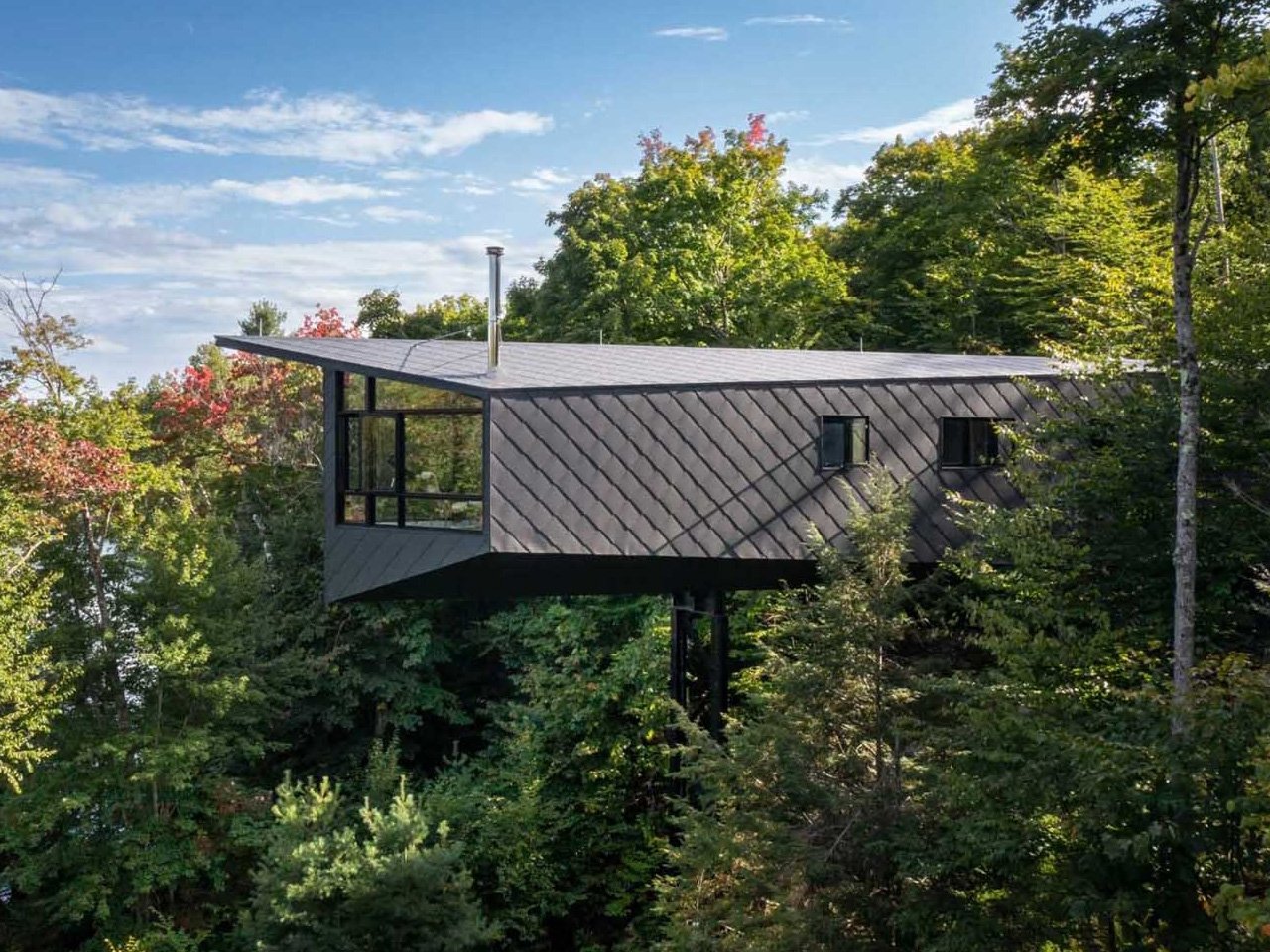 В густых лесах Уэйкфилда, Квебек, появилось необычное строение. Домик для отдыха под названием MORE Cabin, спроектированный оттавской архитектурной студией Kariouk Architects, представляет собой один из самых смелых жилых проектов современной канадской архитектуры: это уединённое жилище площадью 83,6 кв. метра, эффектно парит на высоте 18 метров над лесной подстилкой на одной довольно тонкой стальной опоре.