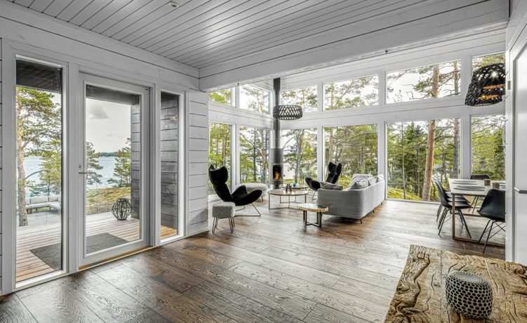 На открытом всем ветрам архипелаге Турку в Финляндии хельсинкская компания по разработке и продаже комплектов бревенчатых домов Pluspuu завершила строительство еще одного экологичного деревянного дома, получившего соответствующее название «Дом на скалах» (House on the Rocks).
