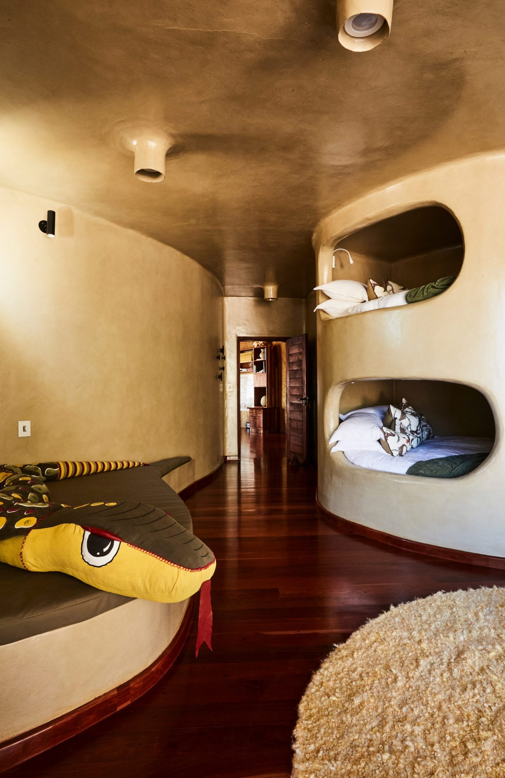 Трехэтажный гостевой дом полностью автономен и работает от собственных источников воды и электричества. Подобно гнезду общительного ткача, здание имеет выпуклые выступы в разных точках.