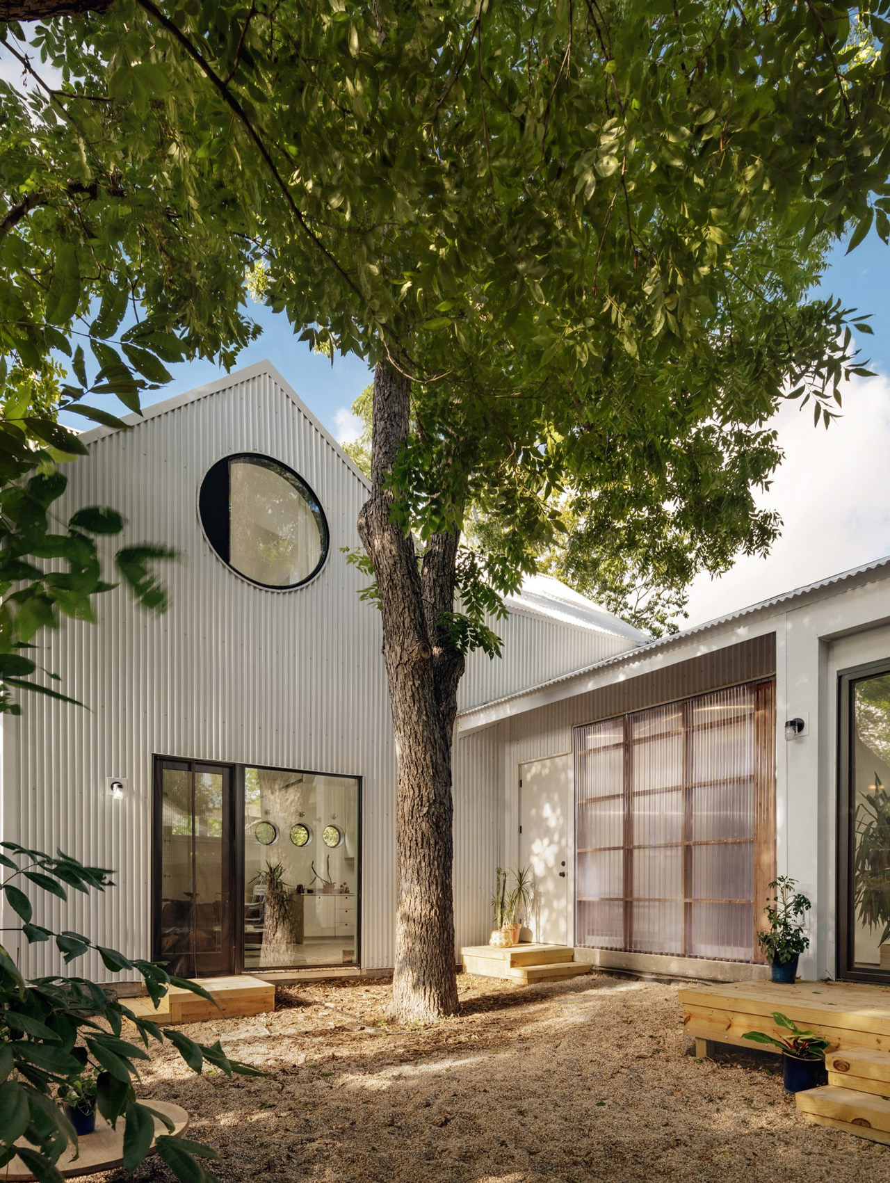 Для облицовки фасада дома, а также для кровли была использована экологичная гофрированная сталь, придающая ему довольно интересные тактильные характеристики, а также полностью пригодная для вторичной переработки. Дом может похвастаться большими круглыми окнами, которые придают ему сходство со скворечником.