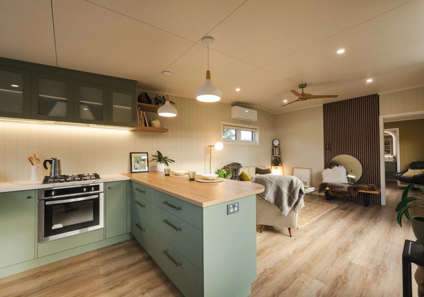 Центральное место занимает просторная гостиная, которая по меркам мини-домов выглядит особенно впечатляюще. В ней размещены диван, кресла и большой телевизор, а также предусмотрены потолочный вентилятор и кондиционер. Большие стеклянные двери усиливают ощущение открытого пространства. Рядом расположена кухня с барной стойкой на двоих, оснащенная всей необходимой техникой, включая плиту, духовку, холодильник и вместительные шкафы.