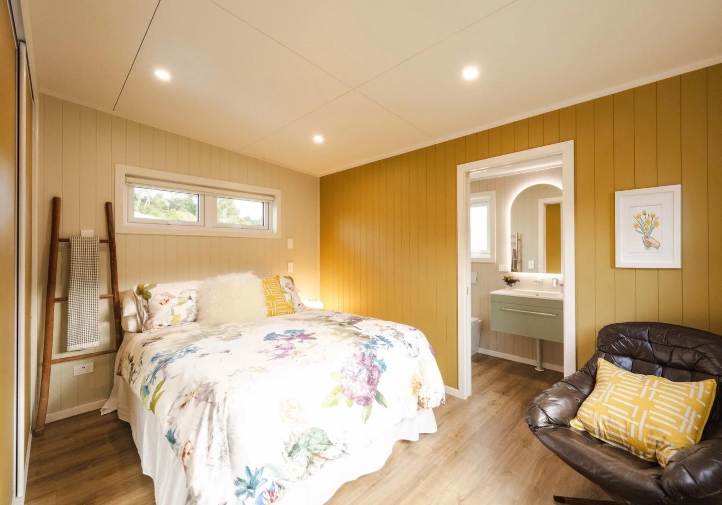 Спальня находится в противоположной части дома и выполнена в полноценном формате без второго уровня, что позволяет свободно передвигаться в полный рост. Здесь установлена двуспальная кровать и предусмотрены вместительные системы хранения. Такое решение делает комнату максимально удобной и функциональной для постоянного проживания.