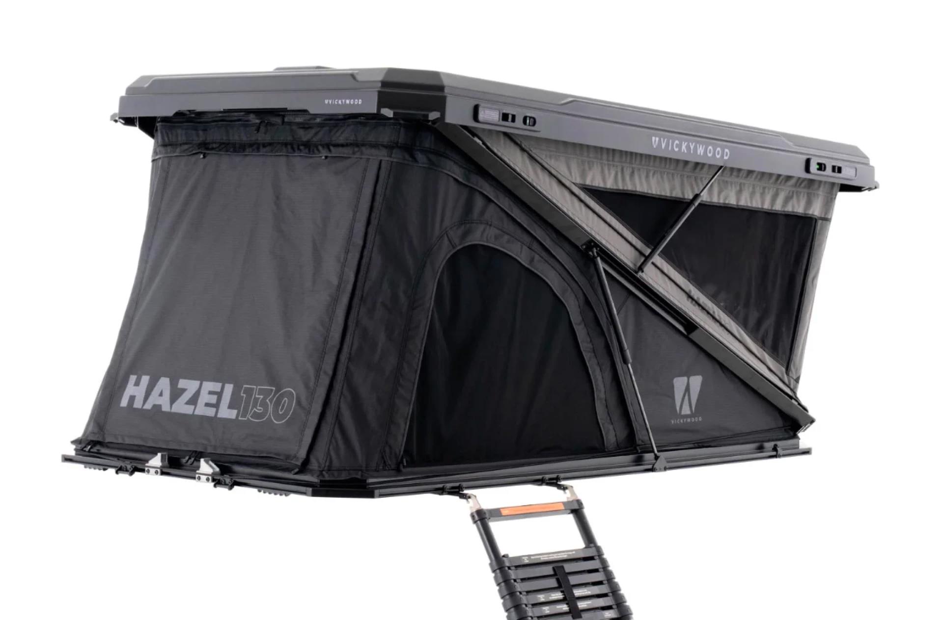 Hazel имеет Z-образную конструкцию с диагональными центральными балками и оснащена молнией, которая проходит по нижнему периметру балок, а также по периметру крыши и основания, превращая палатку в продуваемый ветерком балкон. Модель Hazel 130 включает надувной матрас из пены с эффектом памяти и двухместное спальное место размером 200 x 110 см. Телескопическая лестница помещается в отдельную сумку и выдвигается на высоту до 2,3 метра. Разноцветные светодиодные ленты длиной 1,5 метра на потолке обеспечивают интегрированное освещение.