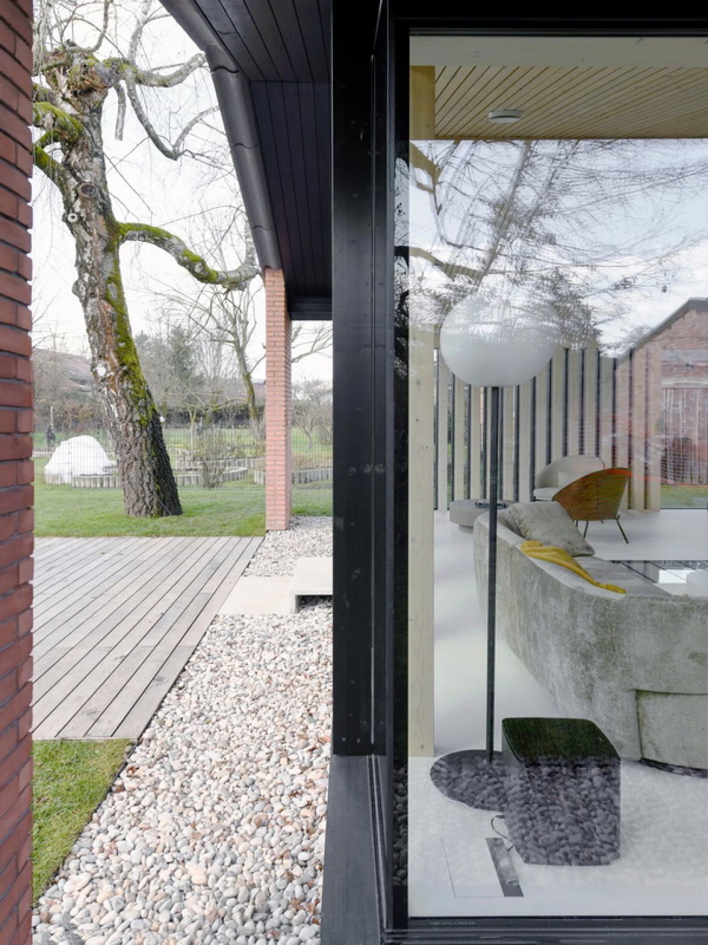С западной стороны появилась пристройка из дерева и стекла, выходящая в сад. Она расширяет жилое пространство и регулирует свет и температуру. Кирпичные колонны напоминают об оригинальном фасаде, а взрослая берёза была сохранена и включена в проект.