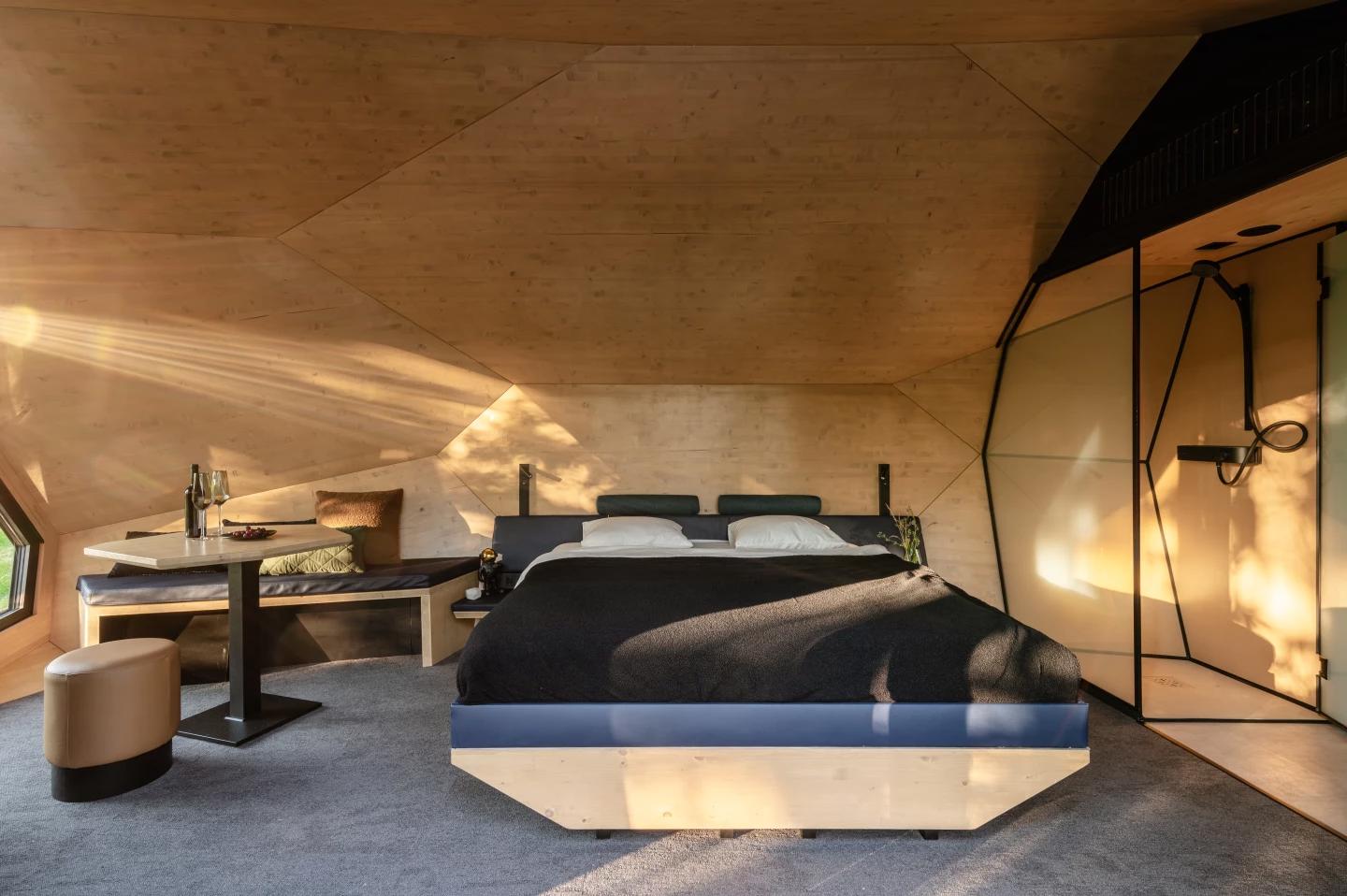 Рядом находится диван-скамья с местом для хранения вещей под ним и столом, а также кровать размера «king-size», которая является единственной спальной зоной. Ванная комната в Pebl Grand оборудована душем и раковиной, хотя неясно, насколько она изолирована от основной жилой зоны. Отсюда дверь ведет в очень маленькую инфракрасную сауну с большим окном.