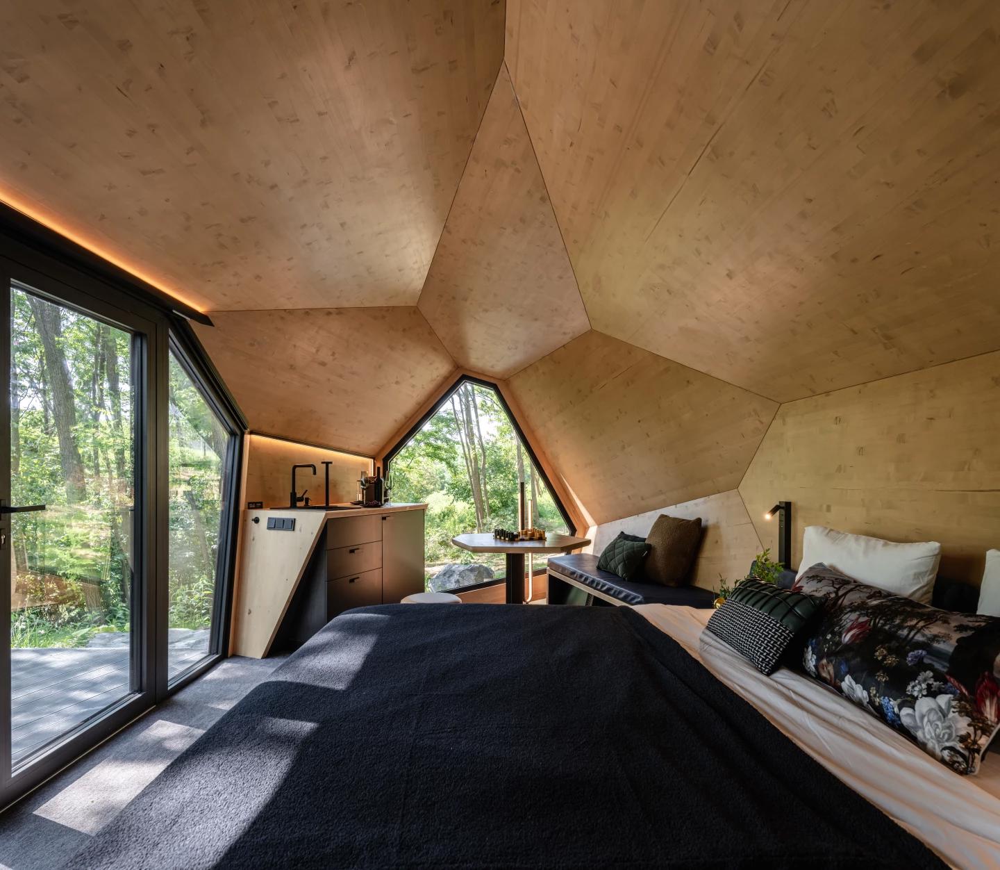 Дом, получивший название Pebl Grand, был спроектирован компанией Hello Wood Studio, которая ранее создала очаровательный дом Jet House. Площадь одноэтажного дома составляет 20,7 кв. метра. Его фасад имеет необычную геометрическую форму, напоминающую валун, которая покрыта зеркальными панелями, но доступны и другие варианты отделки, включая деревянную и каменную.