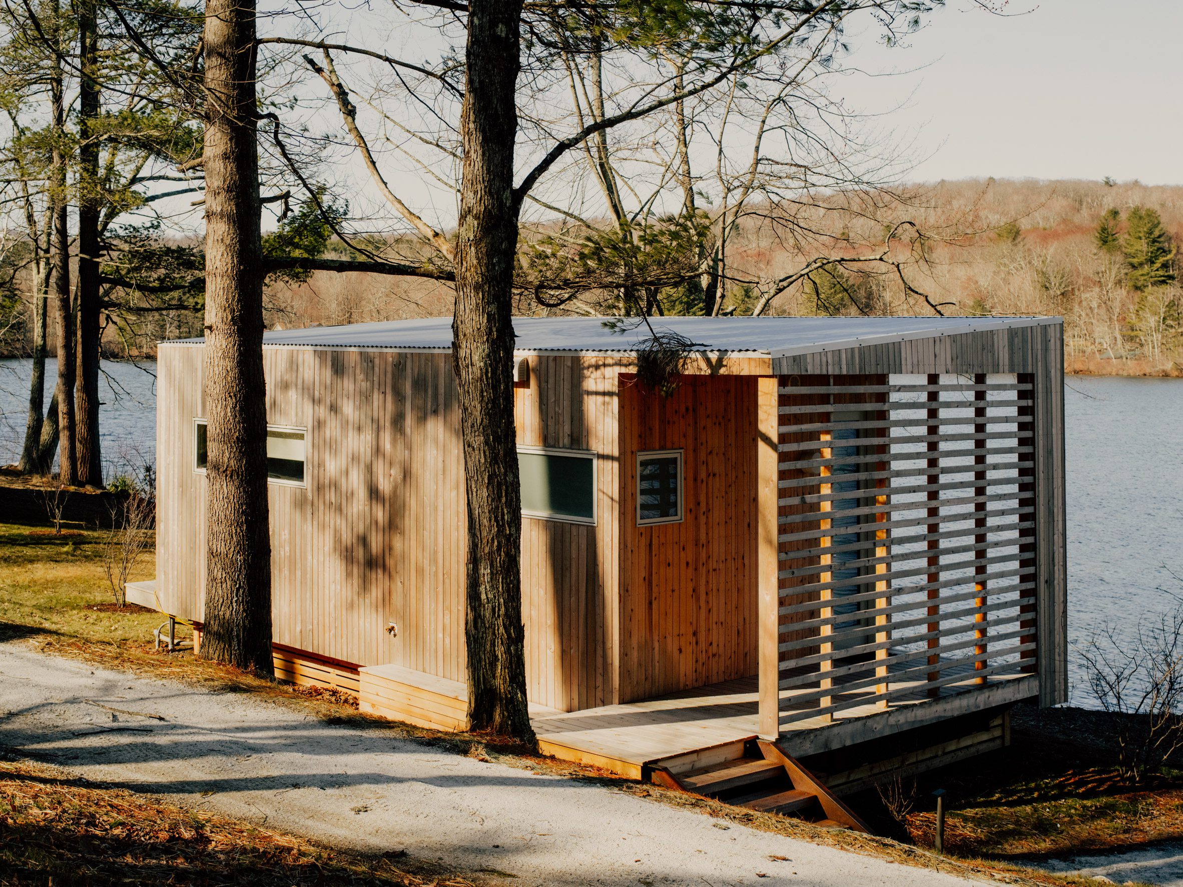 Команда местных строителей и дизайнеров построила 49 сборных кедровых домиков вокруг озера в Массачусетсе, США, и отреставрировала историческое здание, переоборудовав его в ресторан.