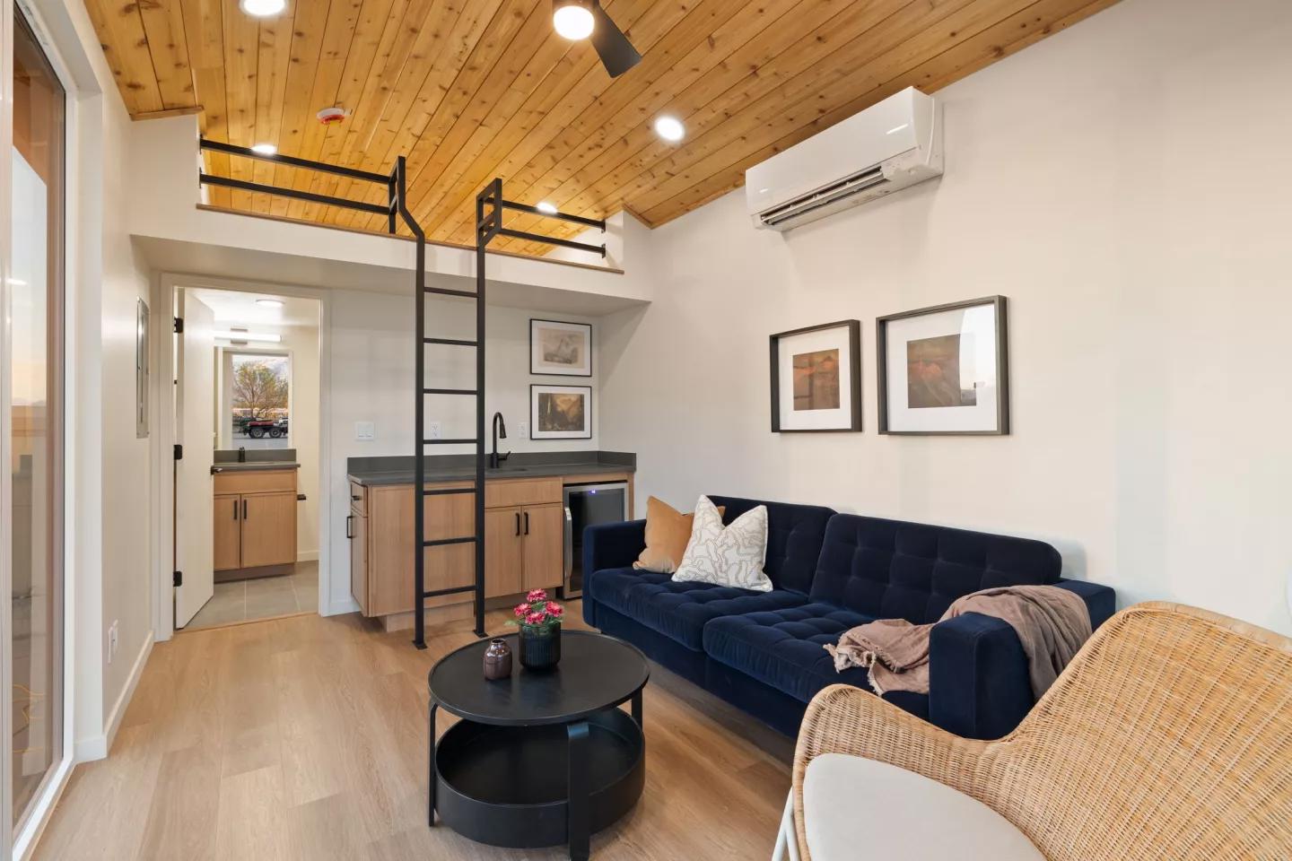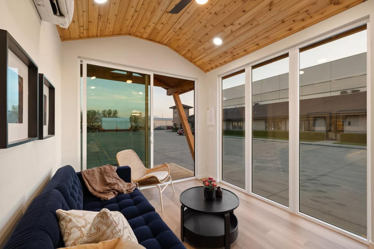 Вход в дом осуществляется через стеклянные двери, ведущие в основное жилое пространство. Внутри предусмотрена гибкая планировка, но даже базовая версия предлагает довольно просторную гостиную для такого формата жилья. Здесь размещены диван, кресло и журнальный столик, а большие окна наполняют интерьер естественным светом. Для комфорта установлен мини-сплит кондиционер.
