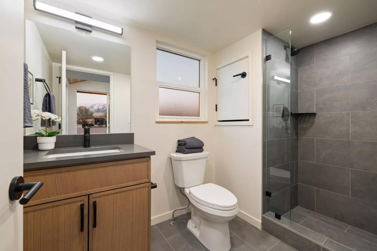 Кухня расположена рядом и выполнена в минималистичном стиле. Она включает раковину, небольшой холодильник и системы хранения. Неподалеку находится компактная ванная комната с отдельным входом, оборудованная душевой кабиной, унитазом и раковиной — всё необходимое для повседневной жизни.