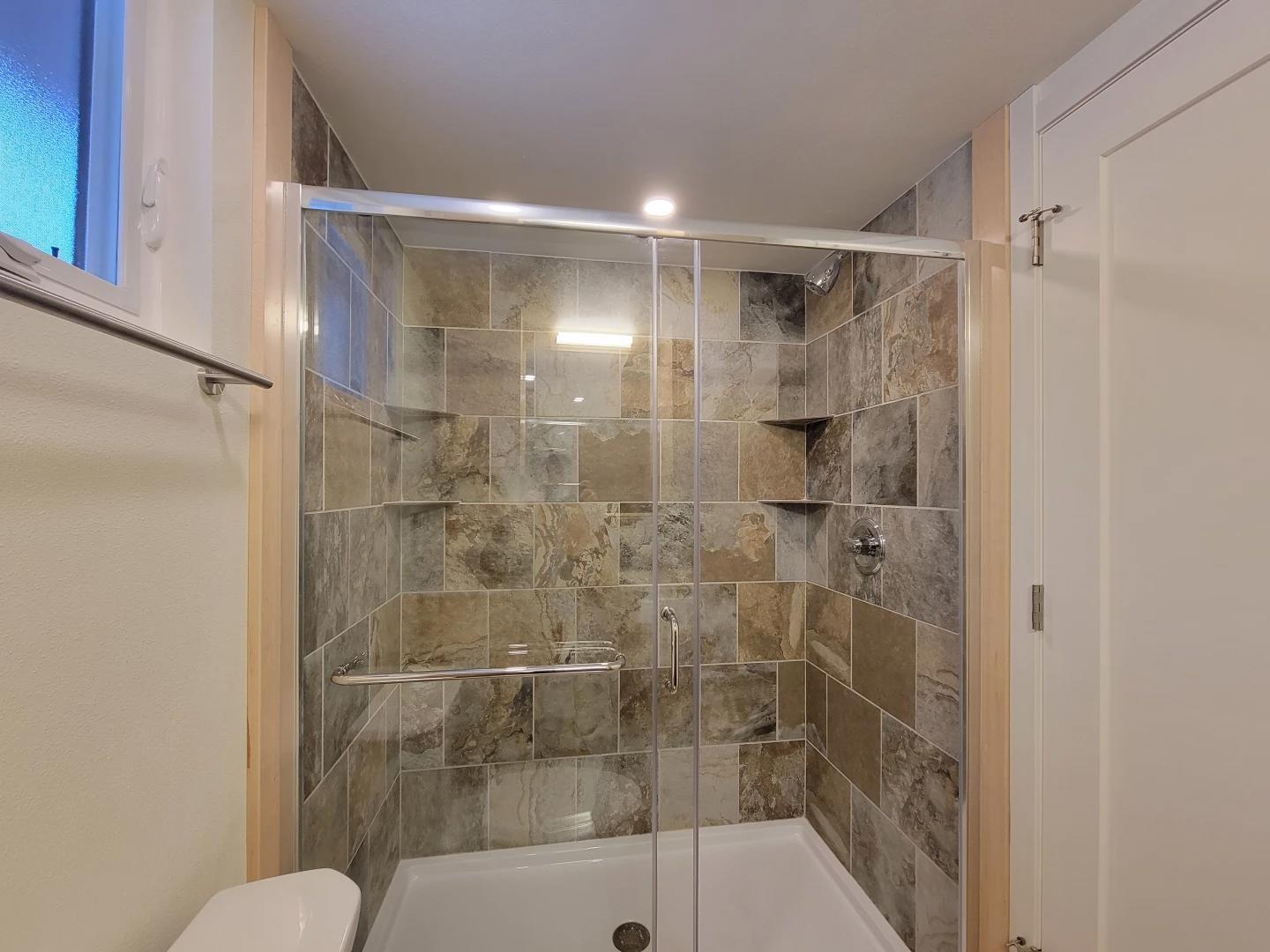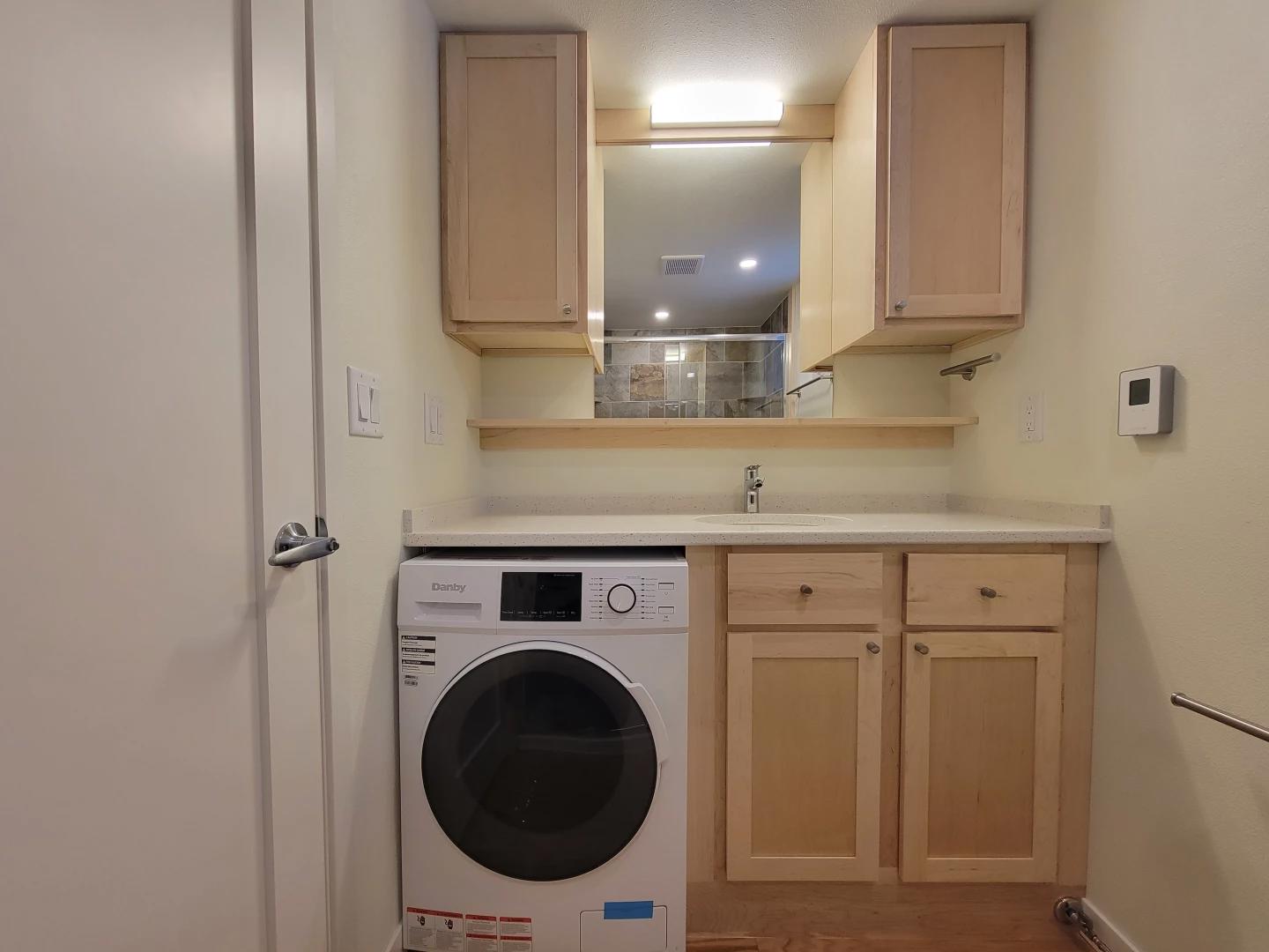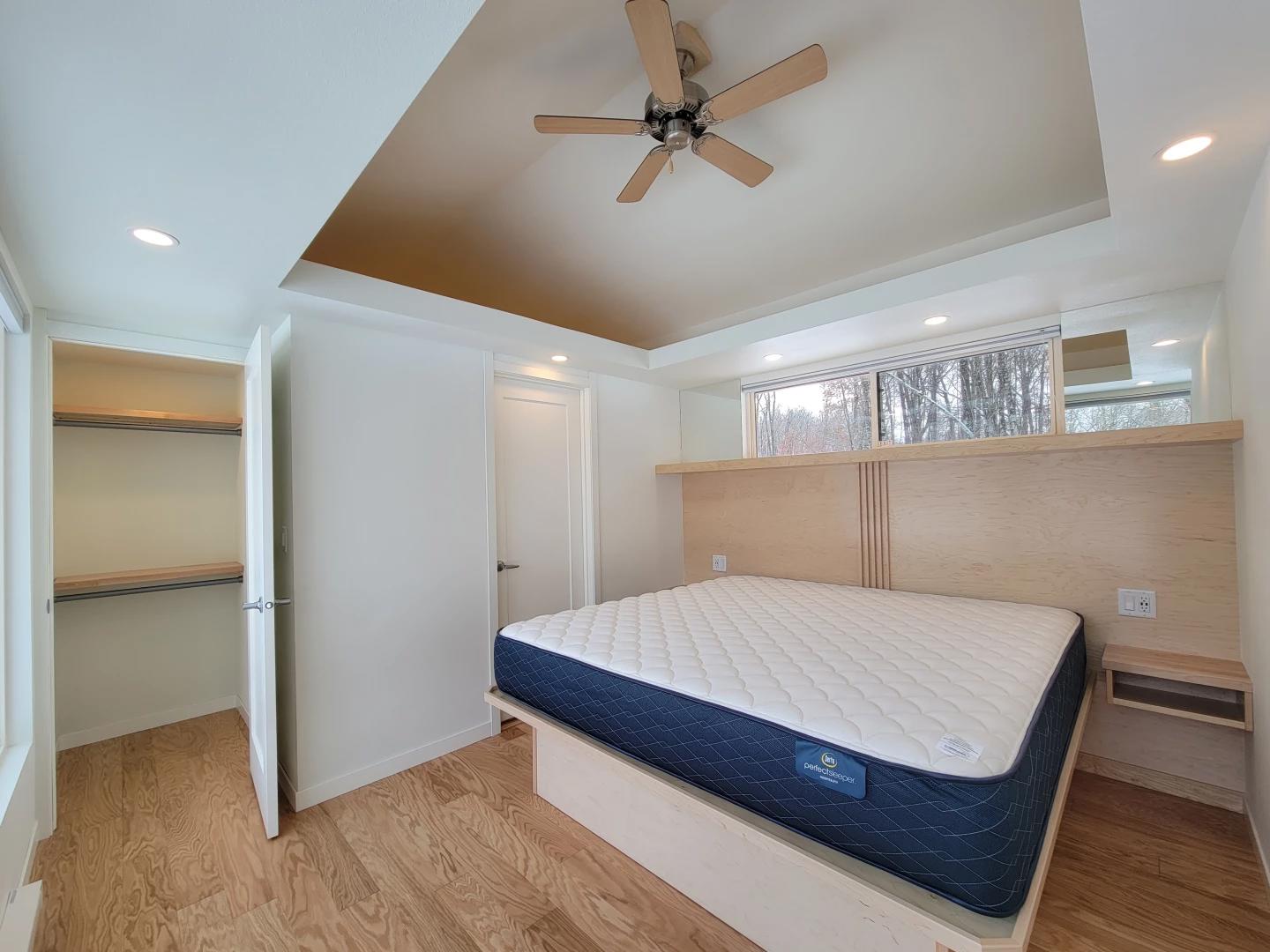 Спальня в этом сборном доме расположена в уединенной части дома и предлагает высокий уровень удобства: кровать king-size, встроенные шкафы и гардеробная. Рядом находится ванная комната с душевой кабиной, стиральной машиной и местами для хранения. Дом Shoreline Glass House уже полностью готов к заселению и доступен для покупки с возможностью аренды участка, что делает его готовым решением для жизни.