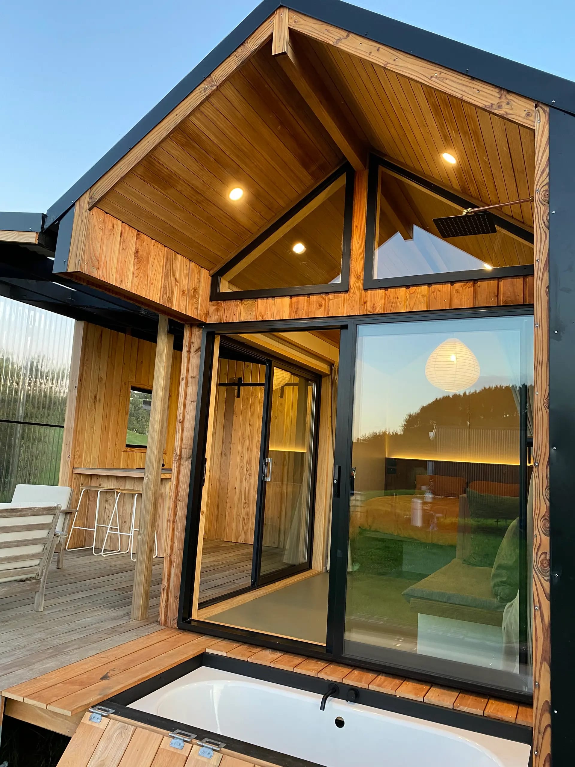Планировка этой модели необычна и лучше подходит для отдыха на берегу моря или для сдачи в аренду, чем для постоянного проживания. Спереди, прямо перед входом, находится душ на открытом воздухе, а также небольшая ванна на открытом воздухе, спрятанная под люком в полу.