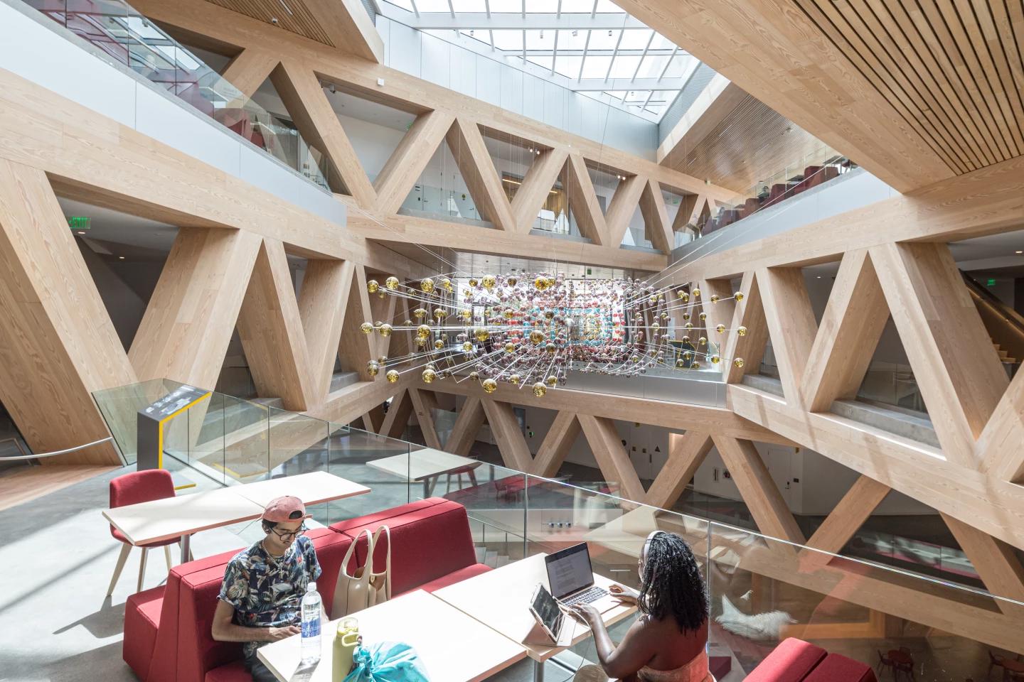 По словам архитекторов, структура здания представляет собой стопку из двух объемов, каждый из которых развернут на 45 градусов относительно друг друга. Пустоты в повёрнутых блоках образуют атриум во всю высоту здания, откуда открывается прямой вид на учебные аудитории на всех уровнях. Фасад выполнен из панелей из армированного стекловолокном бетона, которые создают текстуру, напоминающую древесину, и обеспечивают прочность и огнестойкость.
