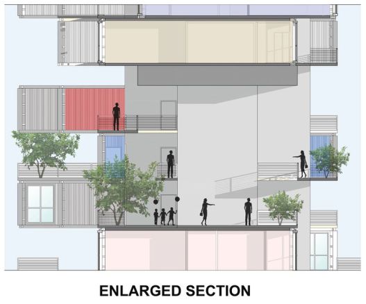 Внешний дизайн небоскреба базируется на особенностях морских контейнеров, окрашенных в различные яркие цвета. Каждая квартира состоит из трех объединенных контейнеров и имеет достаточно пространства для размещения одной семьи. В частности, в квартире имеются два туалета, кухня, кабинет (гостиная), спальня и детская комната, а также открытая терраса и столовая. Все квартиры расположены вокруг центрального ядра здания, которое также включает в себя лестницы и лифты.