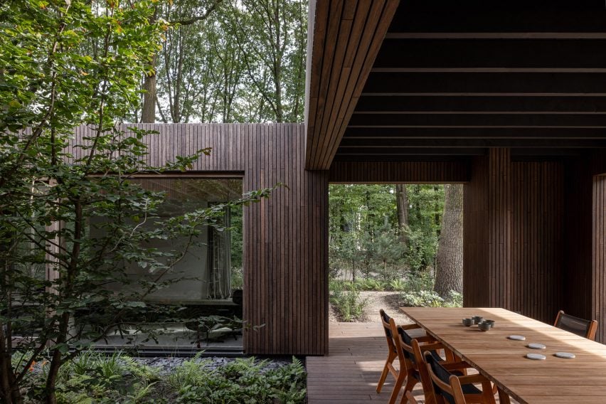 Голландская архитектурная студия i29 построила облицованный бамбуком дом среди деревьев в Лимбурге, Нидерланды, тем самым визуально соединив его с окружающим лесом.